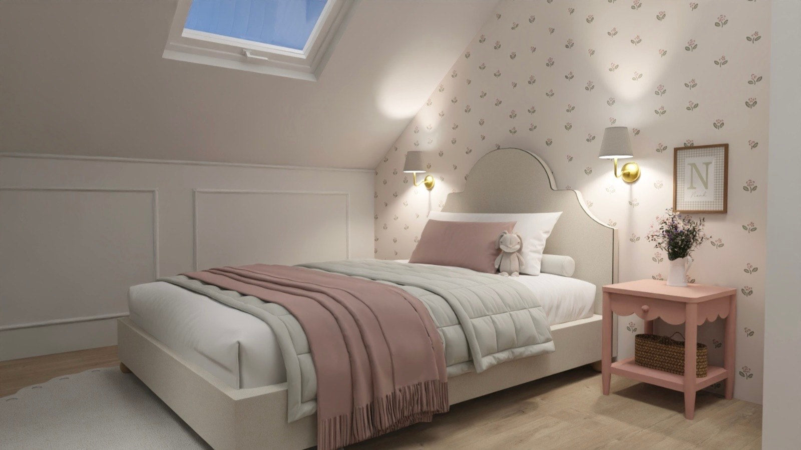 Dziecko nie widzi jej podczas zasypiania (nie rozprasza), ale widzi ją za każdym razem, gdy wchodzi do pokoju. Tapeta tworzy piękne tło dla łóżka — jak ilustracja w książce, w której Twoje dziecko jest głównym bohaterem. To klasyka, która działa zawsze.
