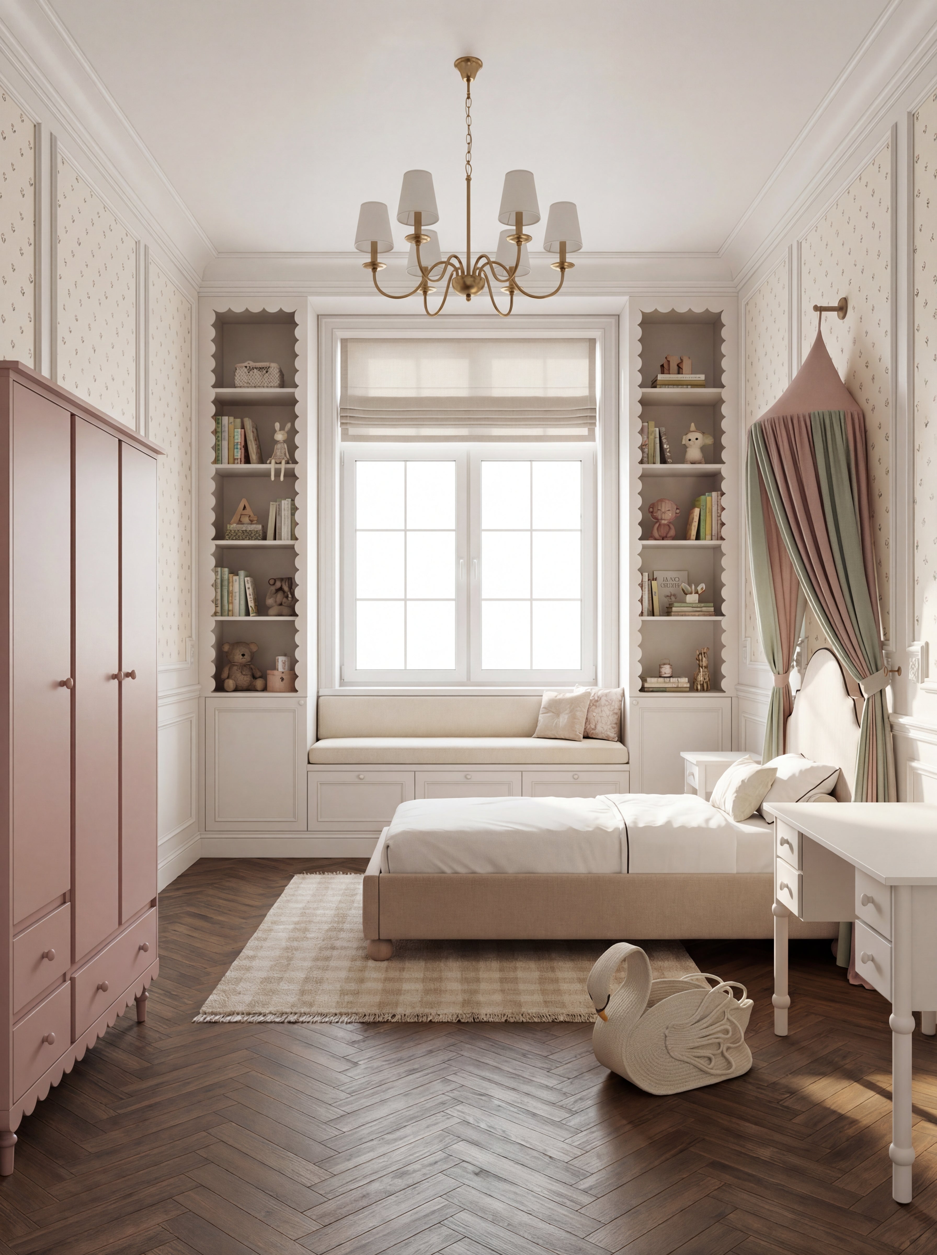 Na wizualizacji, w rogu pokoju lub obok szafy, stoi kosz na zabawki w kształcie łabędzia — detal, który sprawia, że nawet bałagan wygląda elegancko. Bo kiedy pluszaki, lalki i klocki lądują w brzuchu łabędzia — nie są bałaganem. Są skarby w skarbcu.