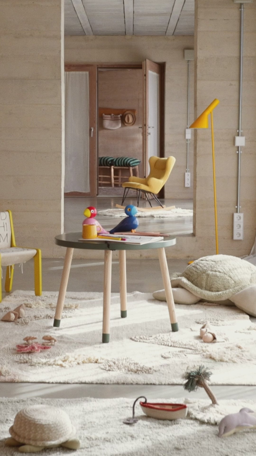 Dywanik "Wyspa" przywodzi na myśl miękkie wydmy piaszczystej plaży. Otoczony jest krótkimi frędzlami w naturalnym i niebieskim kolorze szałwii reprezentującym brzeg oceanu. Dywanik jest dostarczany z zestawem akcesoriów do zabawy: plecionym koszykiem z niebieskiego sznurka szałwiowego, miękkim krabem, ręcznie haftowaną rozgwiazdą i dwiema muszlami z perłami.