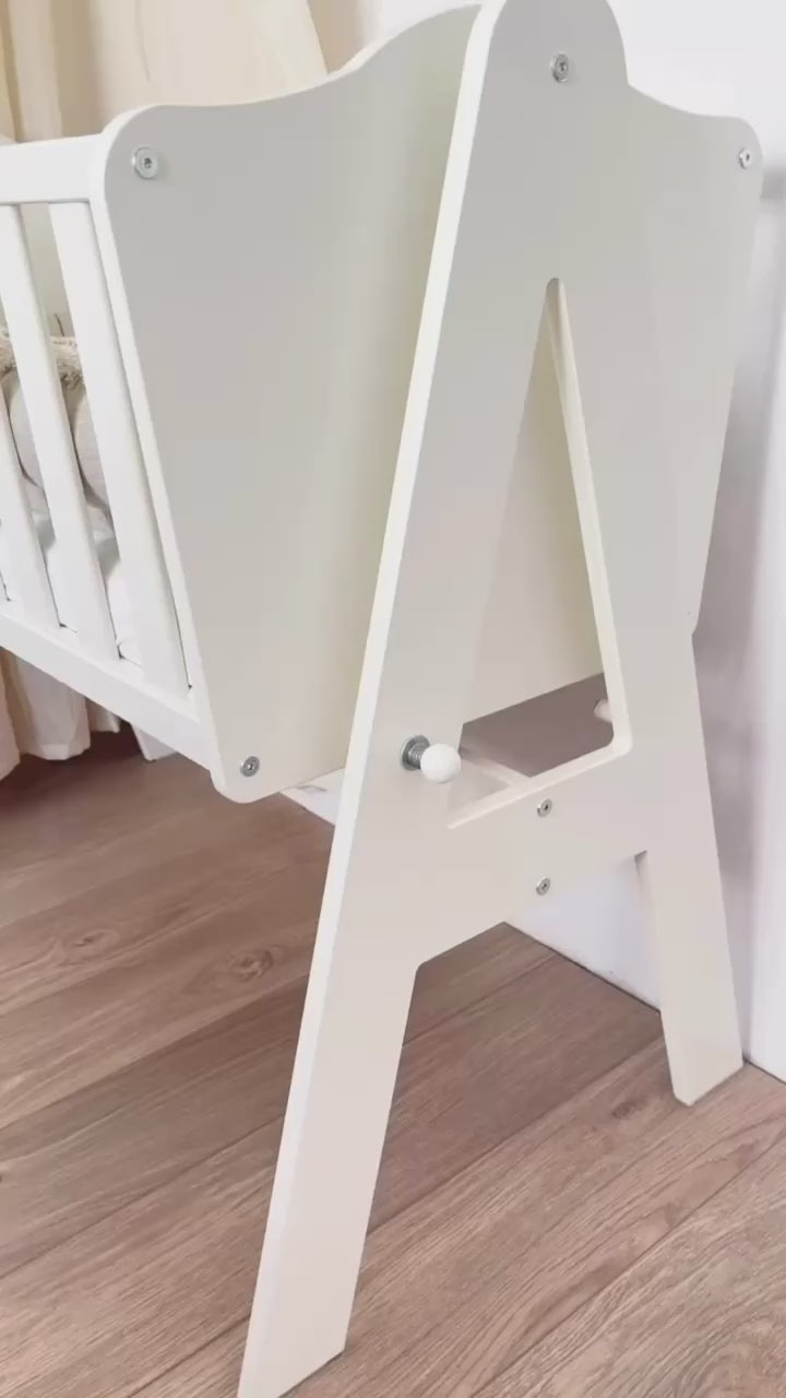 Ponadto, kołyska stoi stabilnie na podłodze, dzięki szeroko rozstawionym nogom w kształcie litery A. Gładkie szczebelki niemowlak może chwytać rączkami.