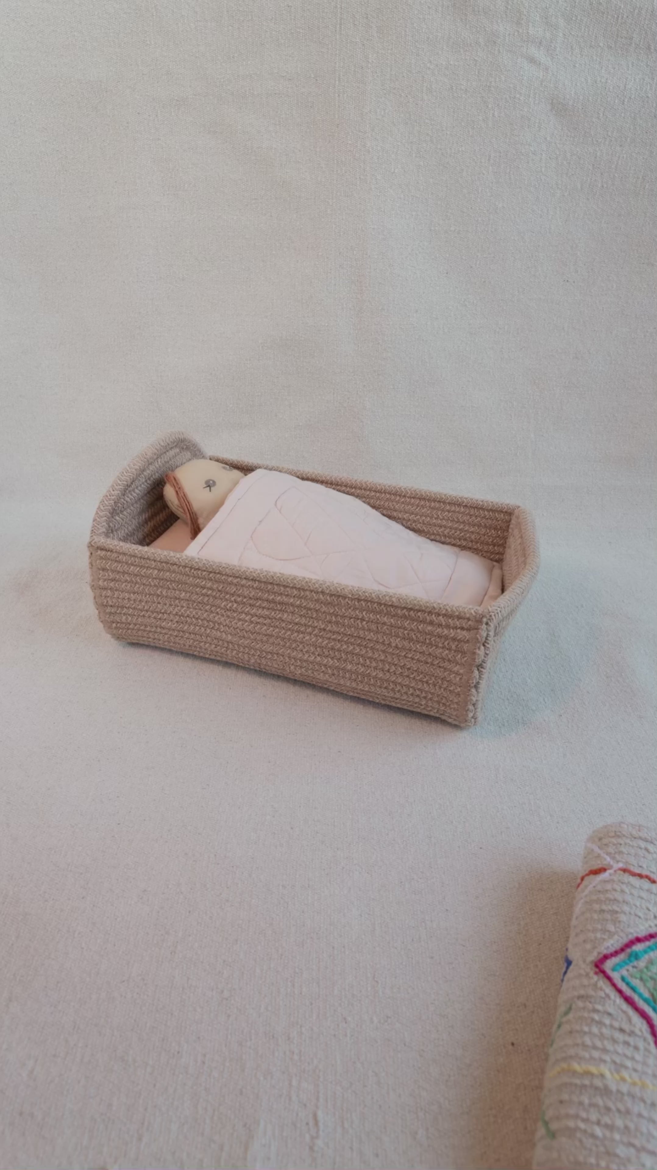 Witaj w moim maleńkim świecie. Mam na imię NARI Jestem uszyta z resztek tkanin powstałych w procesie produkcyjnym. Jestem zrównoważona, urodzona w duchu zero waste. Jestem wyjątkowa jak wszystkie moje koleżanki z kolekcji Mini Lorena. Jesteśmy ręcznie robione. Moje akcesoria są również ekologiczne: pościel wykonana jest z bawełny z certyfikatem GOTS, a łóżeczko jest wykonane z plecionych bawełnianych lin zmieszanych z włóknami butelek PET z recyklingu.